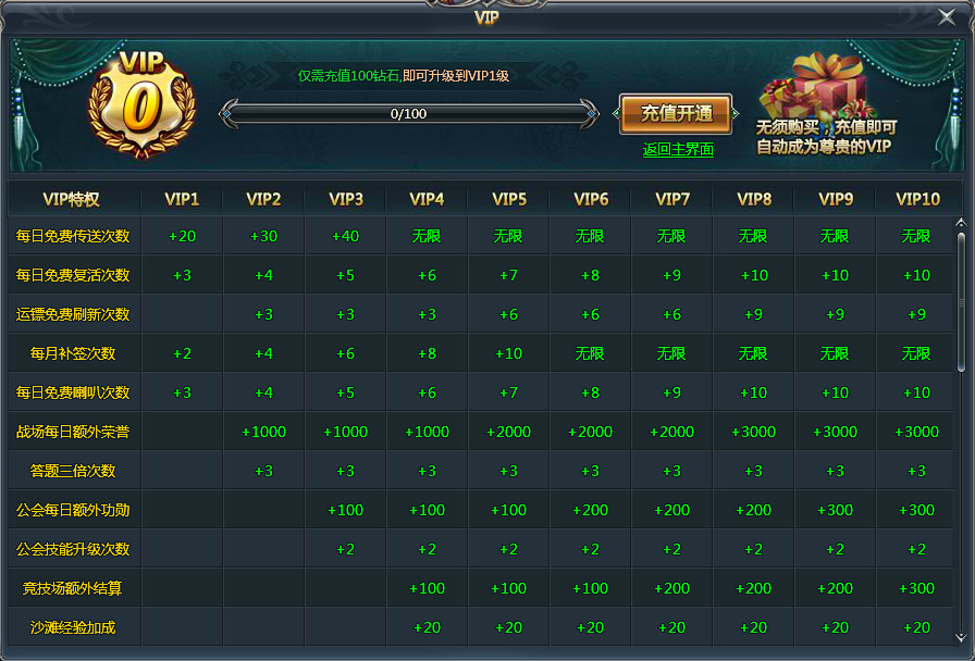 仅需充值100钻石,就能成为尊贵VIP1用户,充值不同的额度,对应的VIP等级不同。成为VIP能获得更多额外收益和实用特权,还可以领取VIP专属礼包和VIP每日礼包。