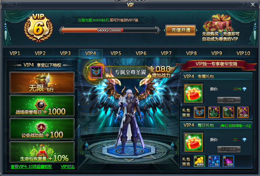 VIP4:免费获得绝版圣翼外型——VIP专属至尊圣翼,绝版圣翼外型,拉风无比,瞬间增加战力1000!